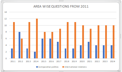The chart and table below give you a clear picture of how questions in PSIR Paper 2, SECTION A have been distributed across Comparative Politics and International Relations over the last 14 years.